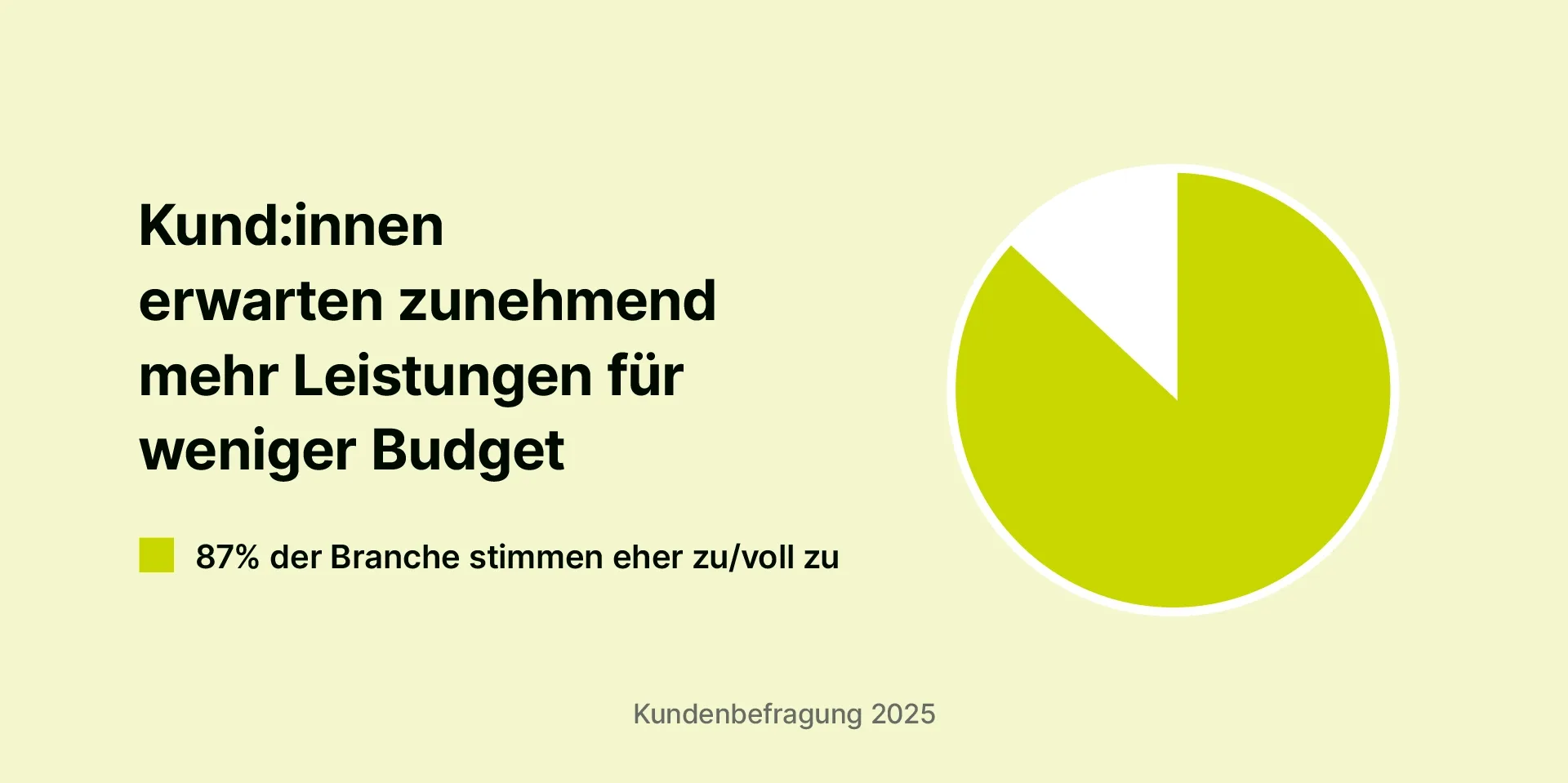 87 % der Befragten stimmen zu: Kund:innen erwarten heute mehr Leistung, obwohl Budgets häufig stagnieren oder sogar sinken. Das verändert nicht nur den wirtschaftlichen Rahmen – es verschiebt auch die Erwartungshaltung an Agenturen als Dienstleister.