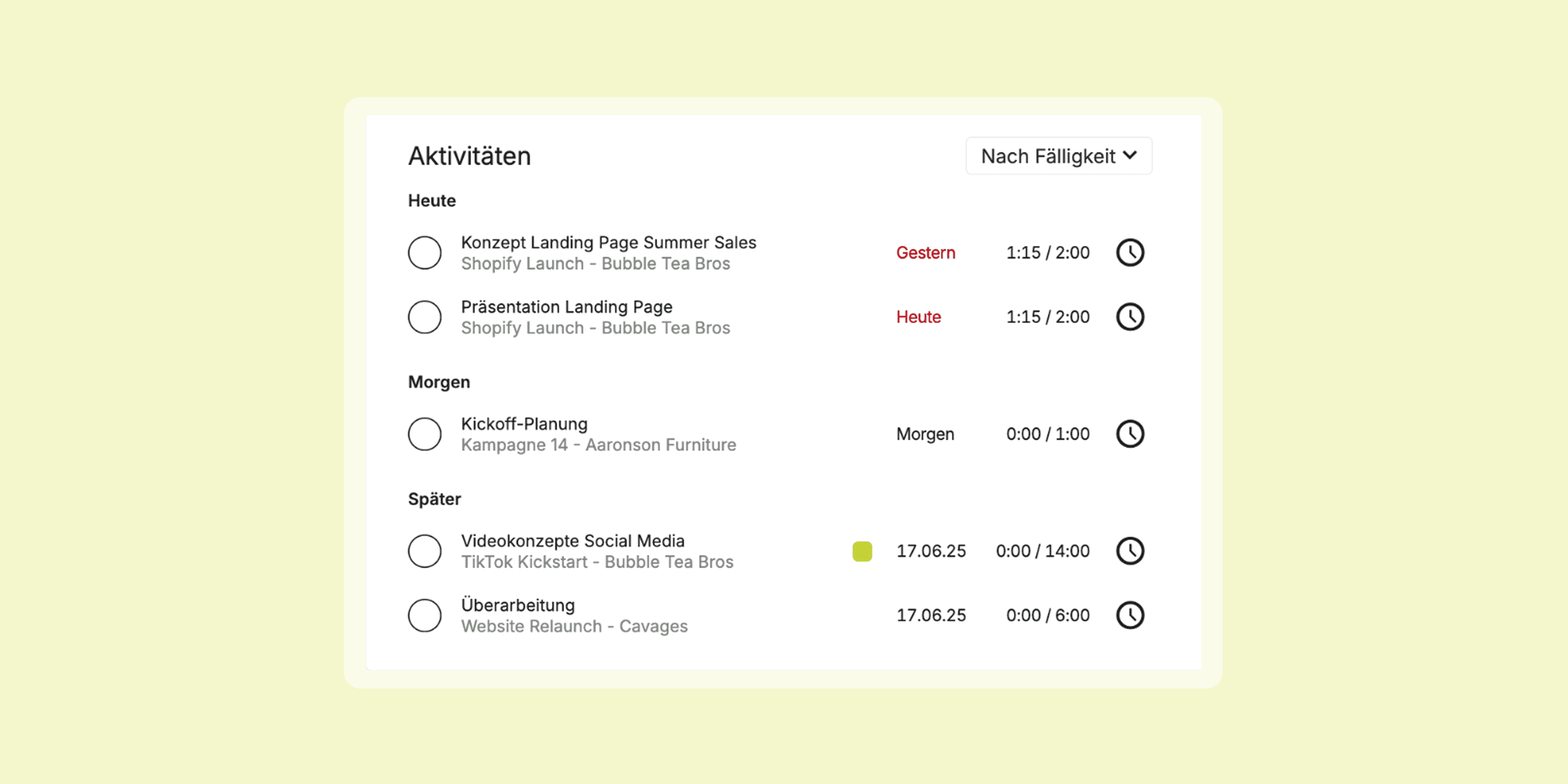 Alle Aufgaben, die Dir zugeordnet sind, landen in diesem Widget – inklusive Soll- und Ist-Zeiten. Mit einem Klick kannst Du Aktivitäten als erledigt markieren und direkt darauf Zeiten erfassen.