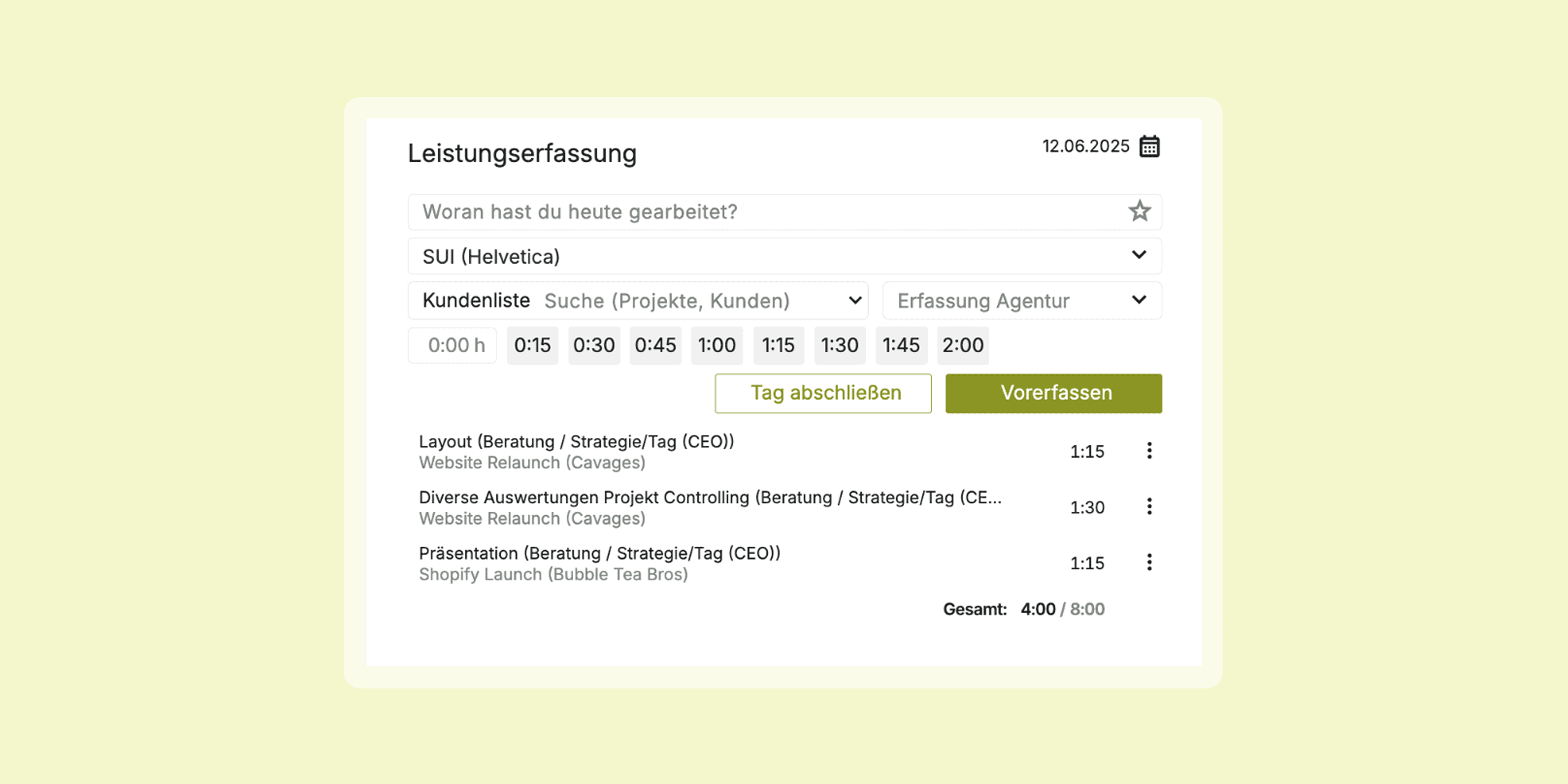 Das Widget Leistungserfassung ist Dein zentrales Tool, um projektbezogene Zeiten zu buchen.